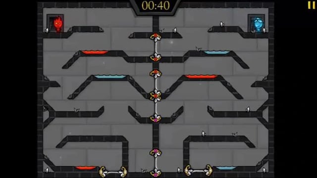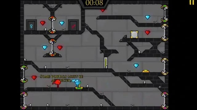 water, while Watergirl can pass through water but must avoid fire. Both characters must navigate the